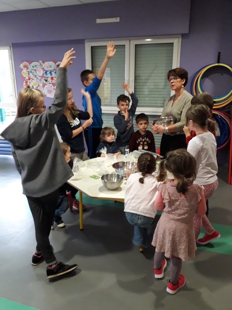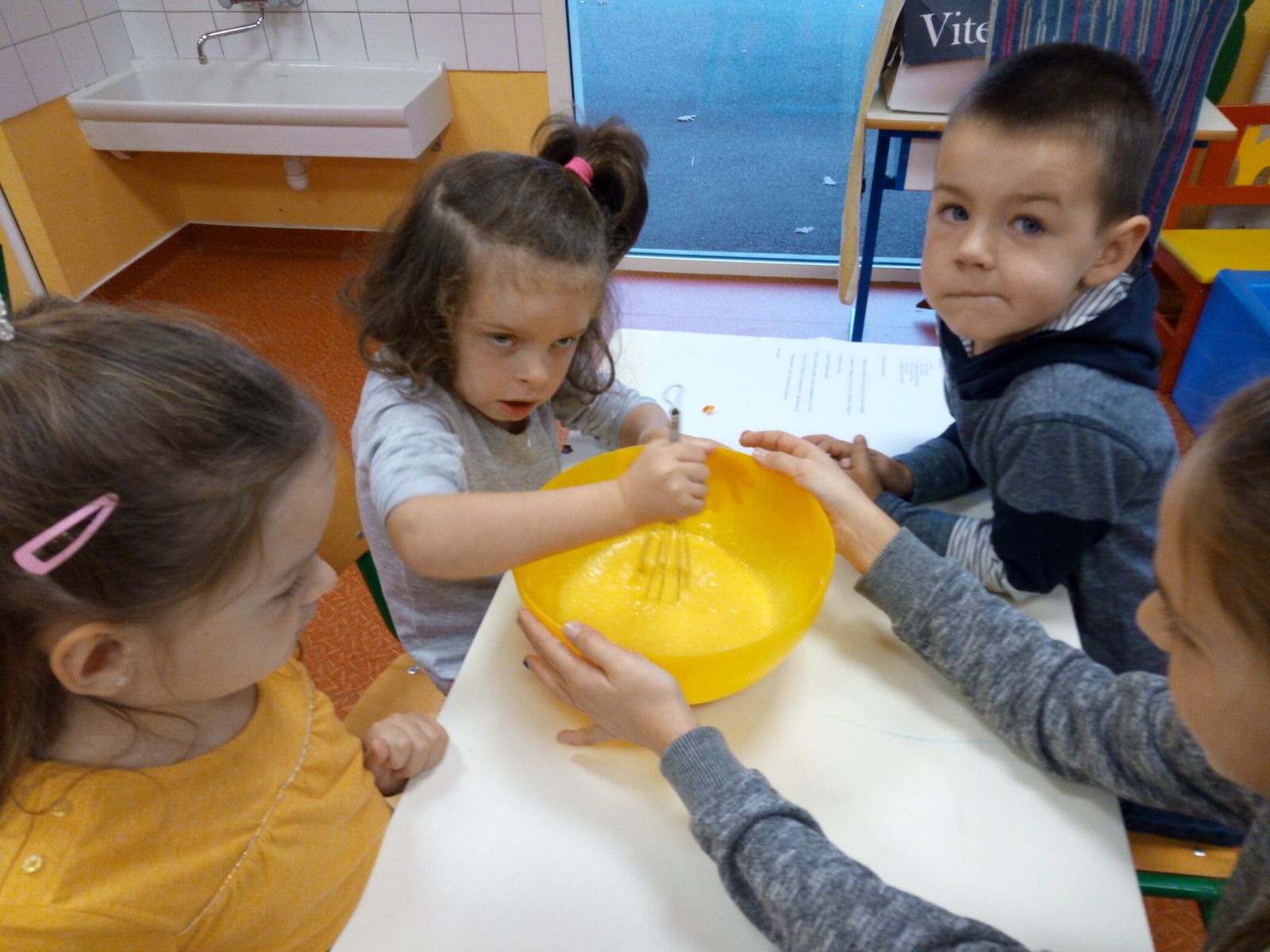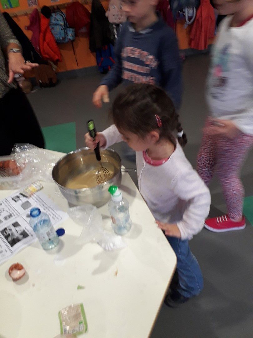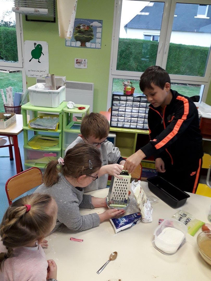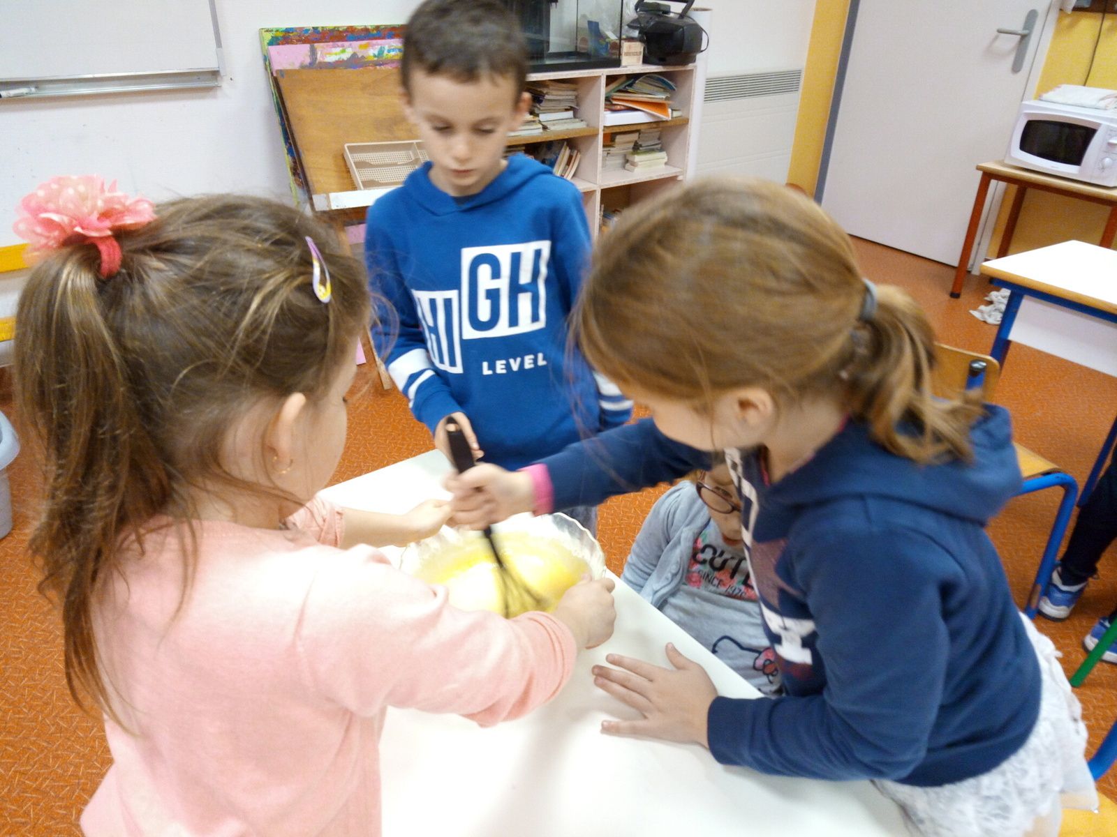 Dans le cadre de la semaine du goût les élèves des 3 classes PS MS, GS CE1 et CM2 ont cuisiné autour de recette du monde. Jeudi, Ils ont travaillé par groupe autonome en se donnant chacun des responsabilités. Grands et petits, tout le monde à mis la main à la pâte afin de réaliser un gâteau anglais, un mexicain et un portugais.