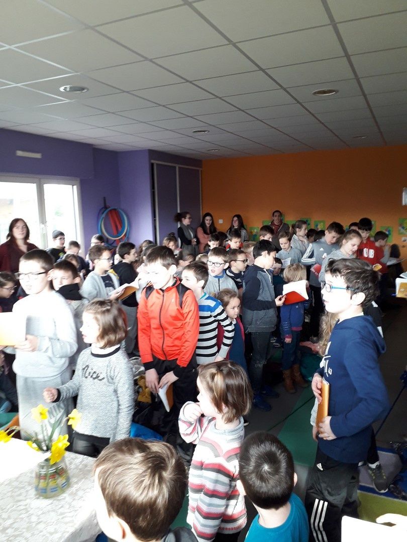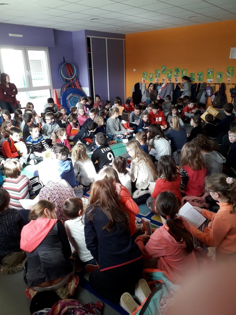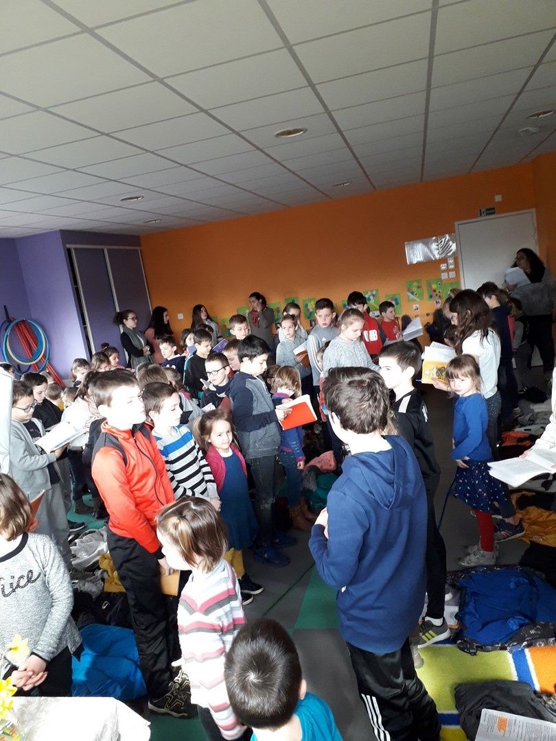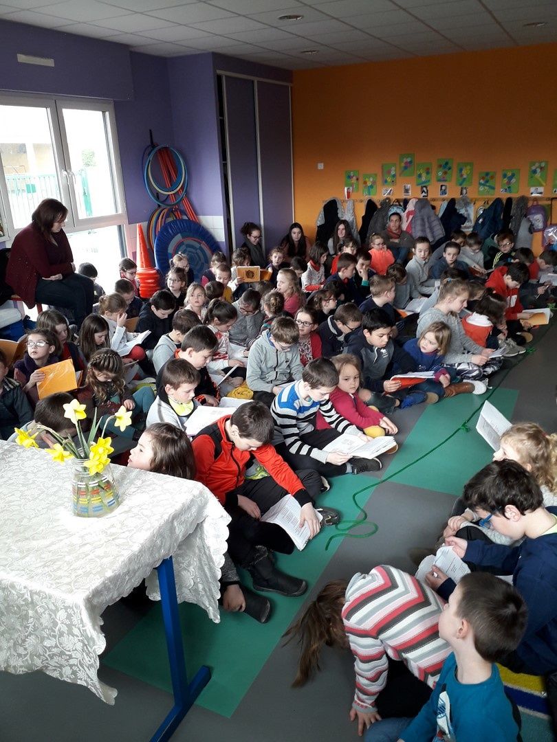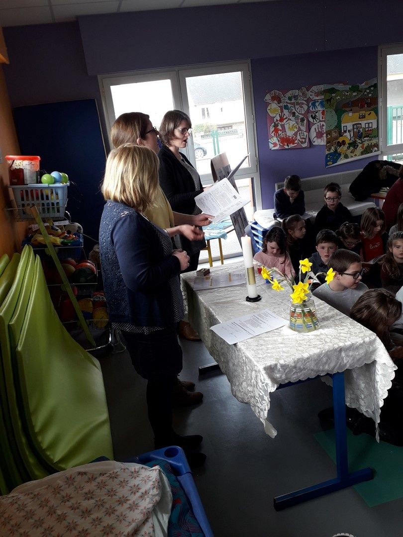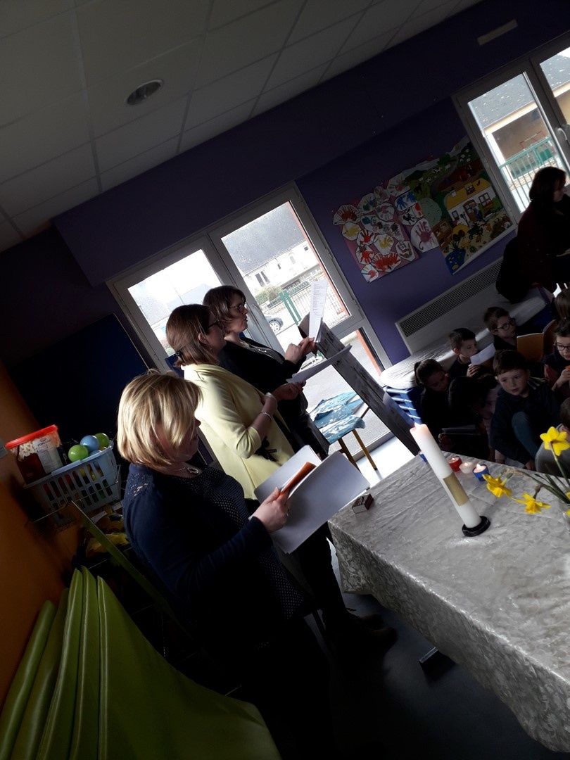 Vendredi 30 mars a eu lieu la célébration de Pâques. Tous les élèves étaient réunis dans la salle de motricité pour partager un temps de chansons et de prières.